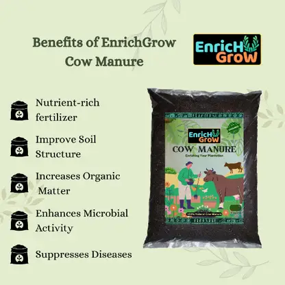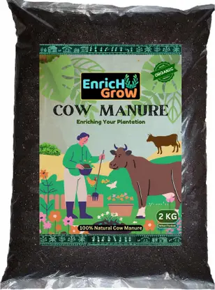 Enrich Grow Cow Dung Manure is a 100% natural, composted, and odorless organic fertilizer designed to enhance soil health and plant growth. Rich in essential nutrients like nitrogen, phosphorus, and potassium, it improves soil structure, fertility, and moisture retention. Ideal for agricultural use, home gardens, kitchen gardens, and outdoor plants, this ready-to-use manure promotes sustainable farming and higher crop yields. Easy to apply and long-lasting, it’s the perfect organic solution for healthier plants and greener gardens.