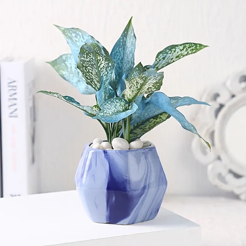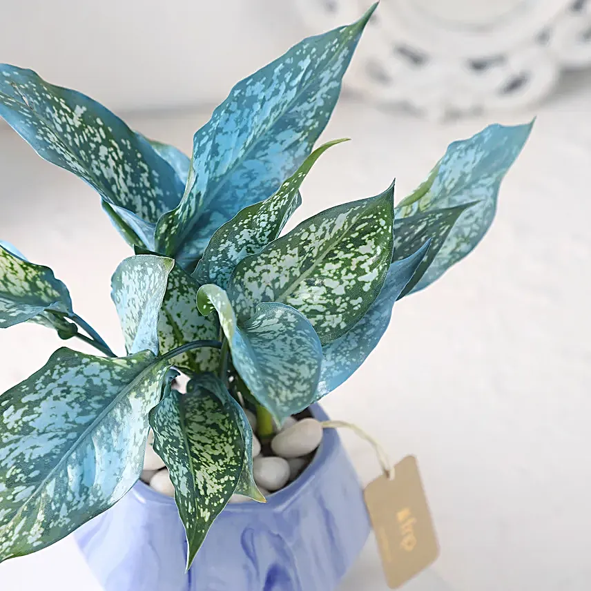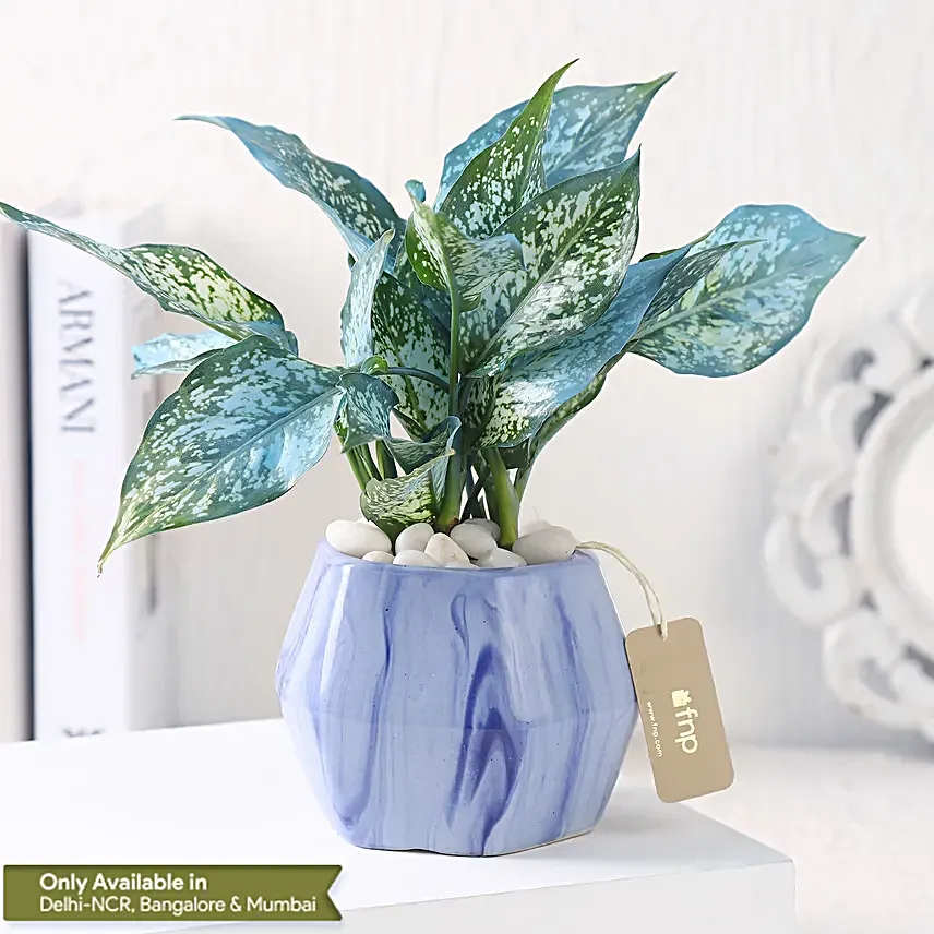 Bring a touch of nature and good fortune to your living space with the Green Aglaonema in Hexagon Pot. This indoor foliage plant features beautiful green leaves with a blue spray accent, planted in an elegant hexagon ceramic pot that complements any corner of your home or office. Aglaonema plants are known for their air-purifying qualities, making them both decorative and beneficial.